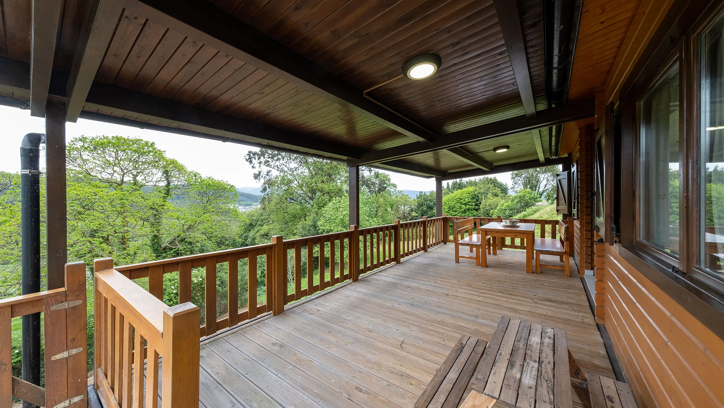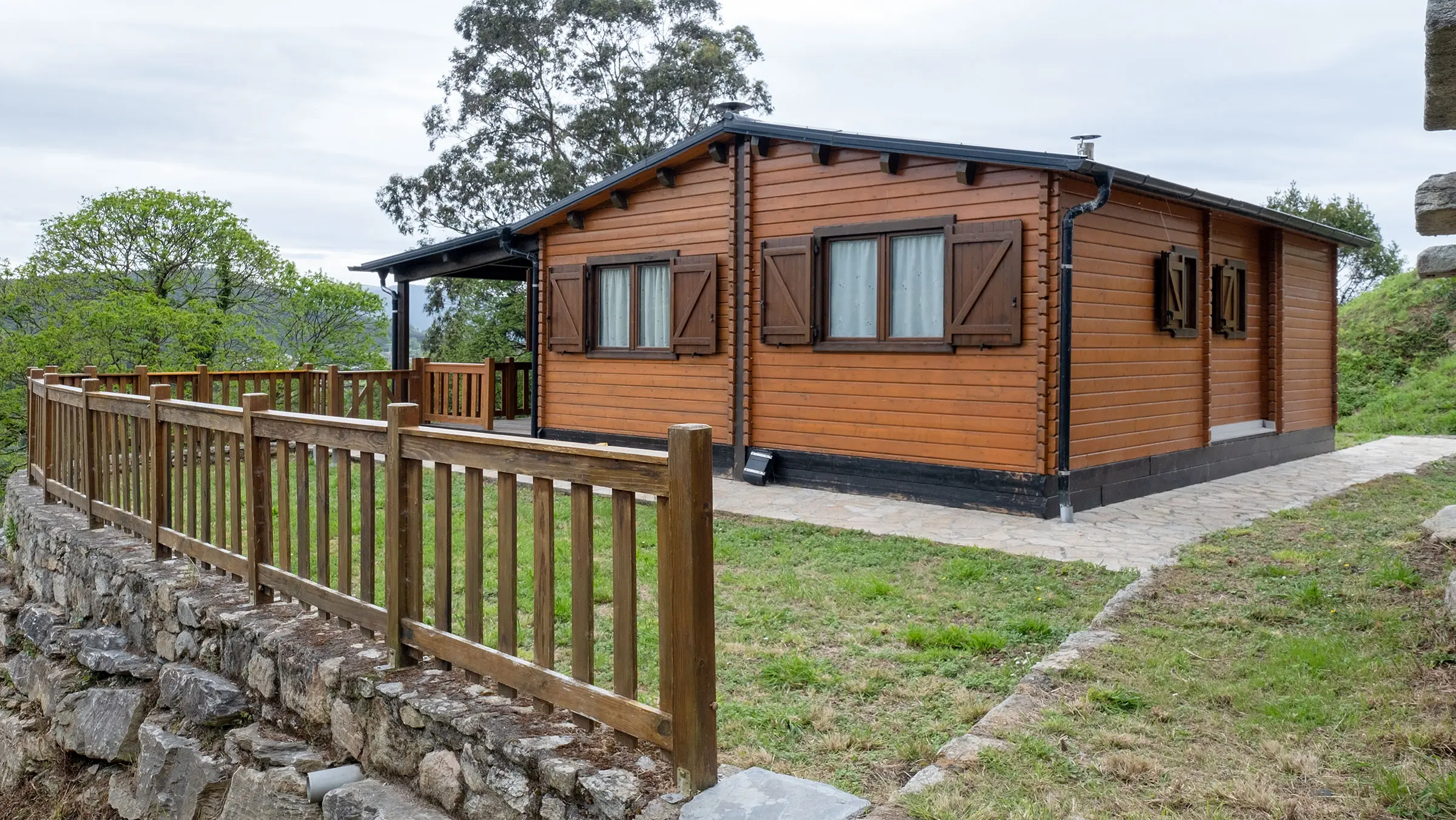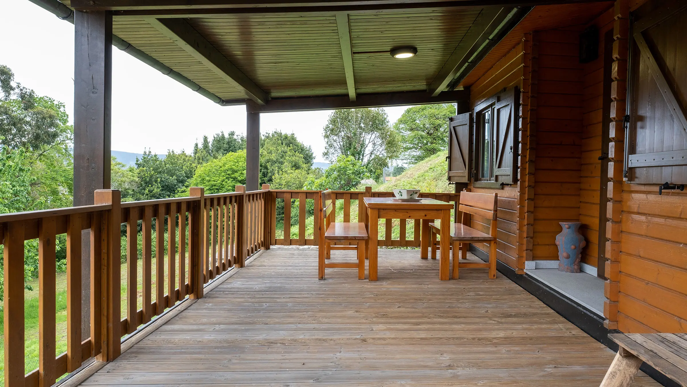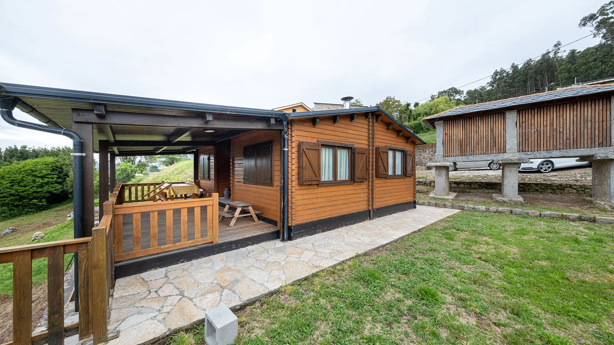 Casa de madera con porche y jardín.