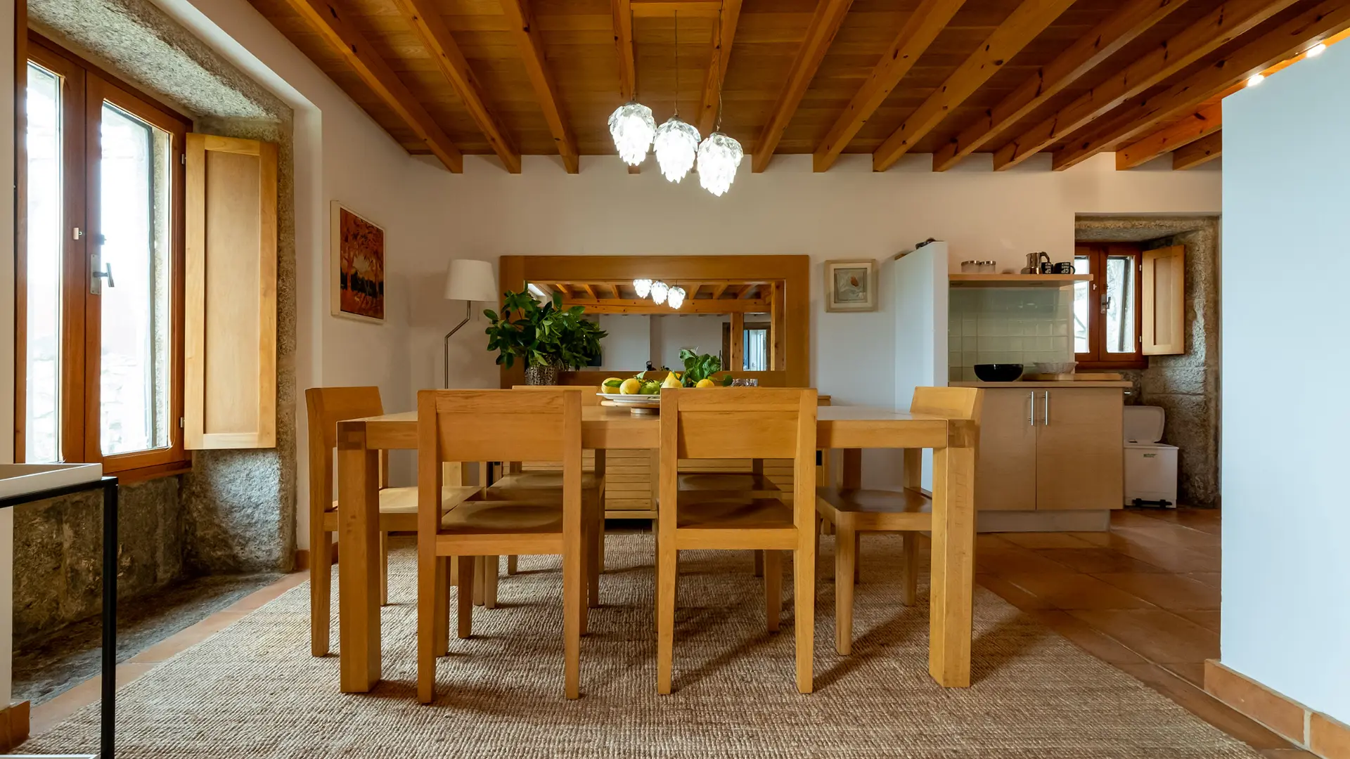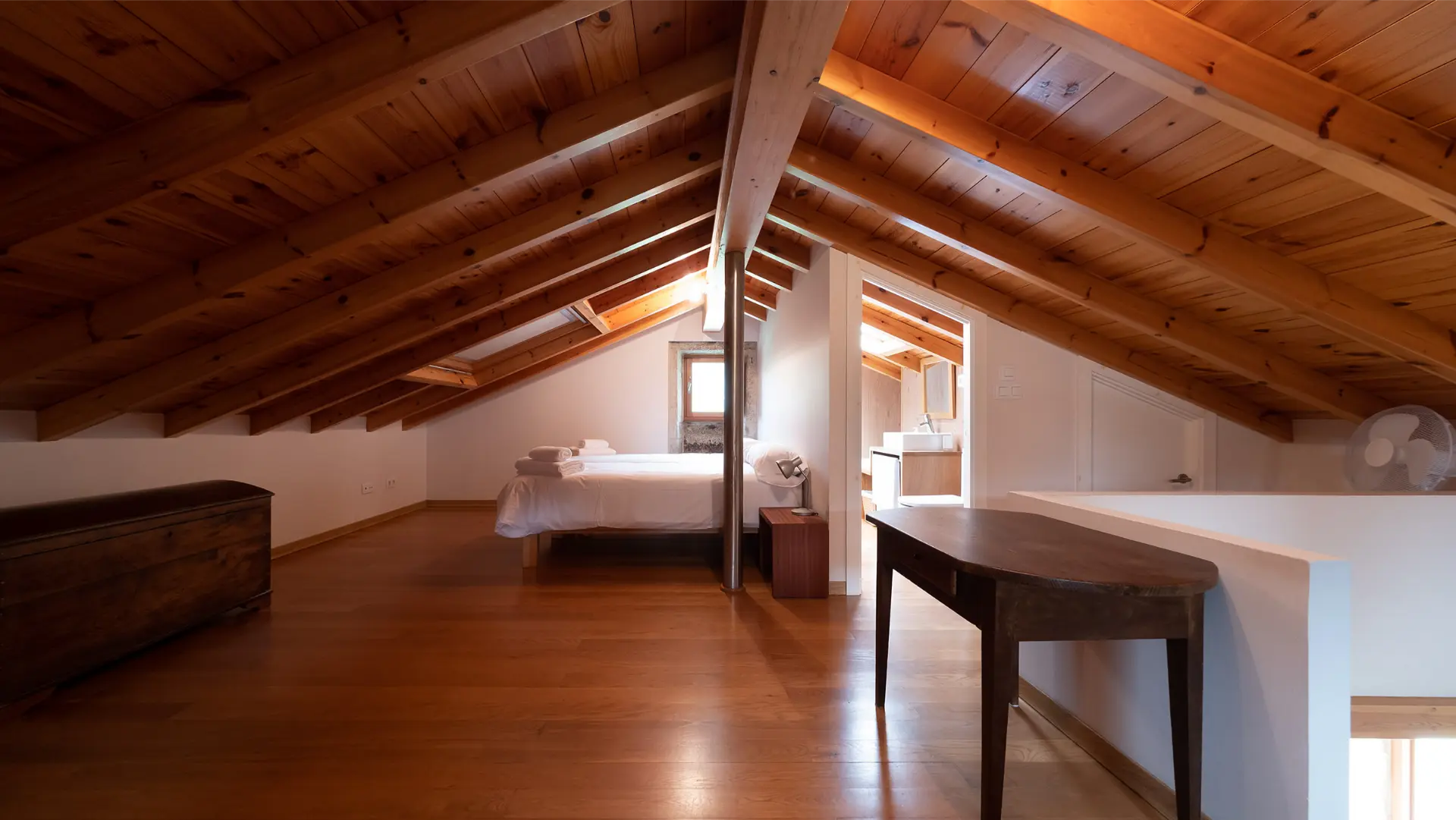 Planta Baja: Habitacion matrimonio con baño, sala con chimenea, escritorio, cocina comedor.